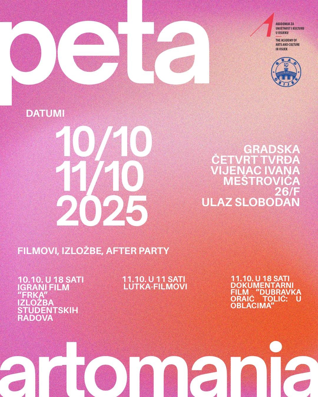 U petak i subotu, u prostoru Gradske četvrti Tvrđa (Vijenac Ivana Meštrovića 26/f) održat će se peto izdanje manifestacije Artomania, koja već tradicionalno okuplja zaljubljenike u film, umjetnost i kreativno stvaralaštvo. Ovogodišnja Artomania održava se u sklopu obilježavanja 20. obljetnice Akademije za umjetnost i kulturu u Osijeku, čime događaj dobiva dodatnu svečanu notu i simbolično povezuje umjetničke generacije koje su obilježile protekla dva desetljeća rada Akademije. Program započinje u petak u 18 sati, prikazivanjem igranog filma „Frka”, redatelja Svebora Mihaela Jelića, u produkciji osječkih producenata Iris Tomić i Svena Latinovića. Ulaz je slobodan, a više o programu saznajte ovdje.
