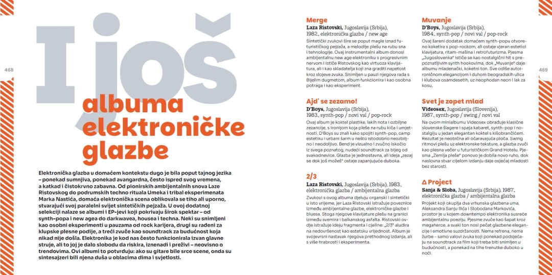 Knjiga pokriva širok raspon žanrova počevši od rocka, popa i novog vala, preko jazza i folka, do hip hopa, trapa i elektroničke glazbe. Posebno je zanimljiv dio posvećen elektroničkoj glazbi, koja se opisuje kao “tajni jezik” regionalne scene: ponekad sumnjiva, ponekad avangardna, često ispred svog vremena. Od ambijentalnih vizija Laze Ristovskog do techno i house izdanja Umeka, Marka Nastića i brojnih drugih, knjiga donosi presjek synth-popa, new agea, darkwavea, housea i techna. Elektronika je, kako stoji u tekstu, često djelovala izvan mainstreama, ali upravo je ta sloboda omogućila eksperiment, otpor trendovima i dugovječnost scene.
