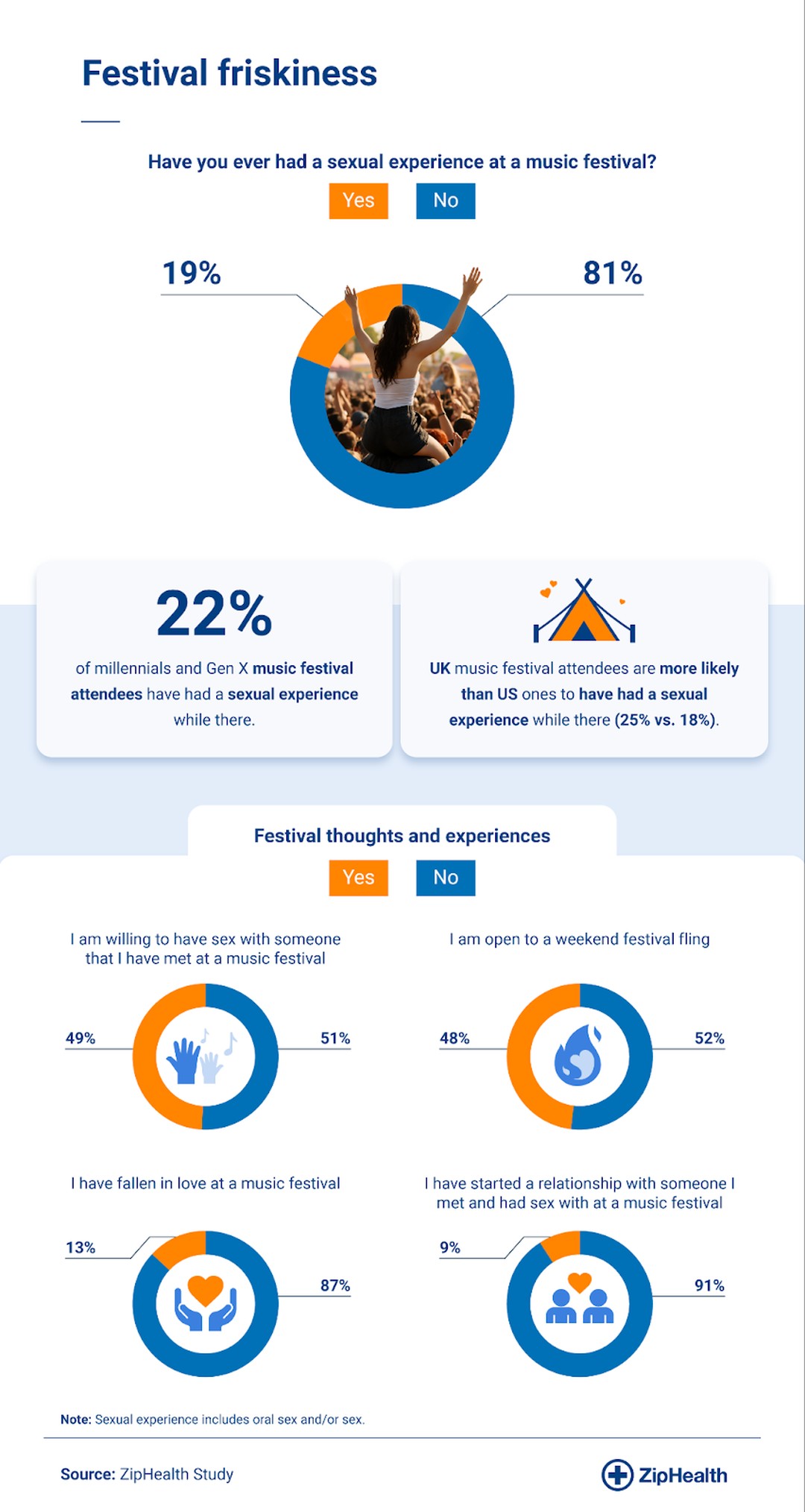 Prema anketi ZipHealtha provedenoj među nešto više od tisuću posjetitelja festivala iz Sjedinjenih Američkih Država i Ujedinjenog Kraljevstva, 19% ispitanika navodi da su imali seksualni susret tijekom festivala. Gotovo polovica sudionika, njih 48%, priznaje da na festival dolazi otvoreno za mogućnost vikend avanture.